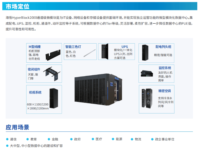 海悟HyperBlock2000雙排微模塊以“構(gòu)建高可靠性、高可用性及運(yùn)維簡(jiǎn)單的綠色數(shù)據(jù)中心”為目標(biāo),是可以實(shí)現(xiàn)獨(dú)立運(yùn)營(yíng)功能的模塊化數(shù)據(jù)中心,完美解決建設(shè)周期長(zhǎng)、資金投入大、運(yùn)營(yíng)費(fèi)用高、管理復(fù)雜等傳統(tǒng)IDC建設(shè)問題。