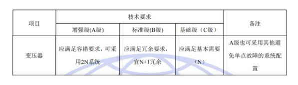 國標GB50174-2017《數(shù)據(jù)中心設計規(guī)范》中對于A、B、C三級數(shù)據(jù)中心變壓器架構的具體要求如下: