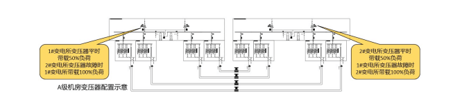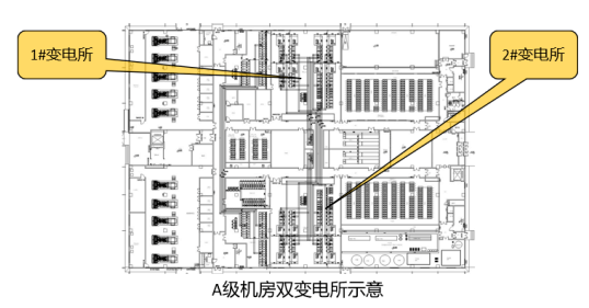 C級、B級機房無變配電所物理隔離要求;若C級、B級機房改A級機房,則每個變電所之間需做物理隔離。若配電系統(tǒng)采用2N構架,則至少需要設置兩個物理隔離的變電所,每個變電所平時各帶50%負荷,當一個變電所完全斷電時,另一個變電所帶載100%負荷。若配電系統(tǒng)采用2+1的DR構架,則至少需要設置三個物理隔離的變電所,每個變電所平時各帶66%負荷,當其中一個變電所完全斷電時,另兩個變電所帶載100%負荷。