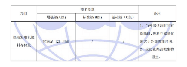 國標GB50174-2017《數(shù)據(jù)中心設計規(guī)范》中對于A、B、C三級數(shù)據(jù)中心后備柴油發(fā)電機燃料存儲系統(tǒng)的具體要求如下:
