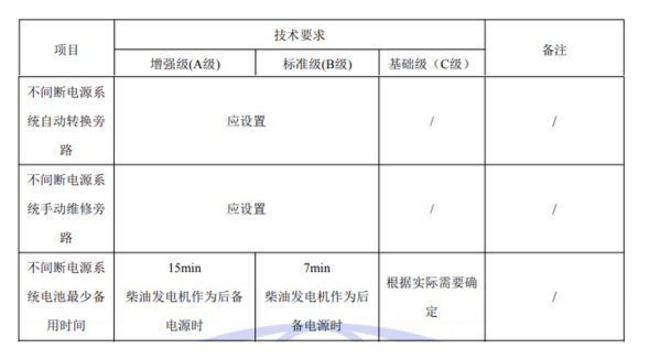 國標GB50174-2017《數(shù)據(jù)中心設計規(guī)范》中對于A、B、C三級數(shù)據(jù)中心不間斷電源系統(tǒng)旁路及備用時間的具體要求如下: