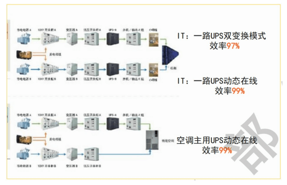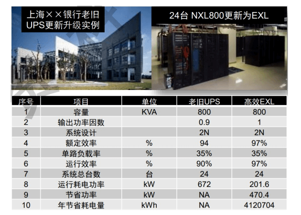 上海某銀行老舊UPS改為高效節(jié)能型UPS后,運行效率可從90%提升至97%。