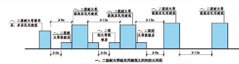 多棟數(shù)據(jù)中心的防火措施主要是加大建筑物之間的間距。防火間距主要是指防止著火建筑在一定時間內(nèi)引燃相鄰建筑。規(guī)范規(guī)定的防火間距如下圖所示: