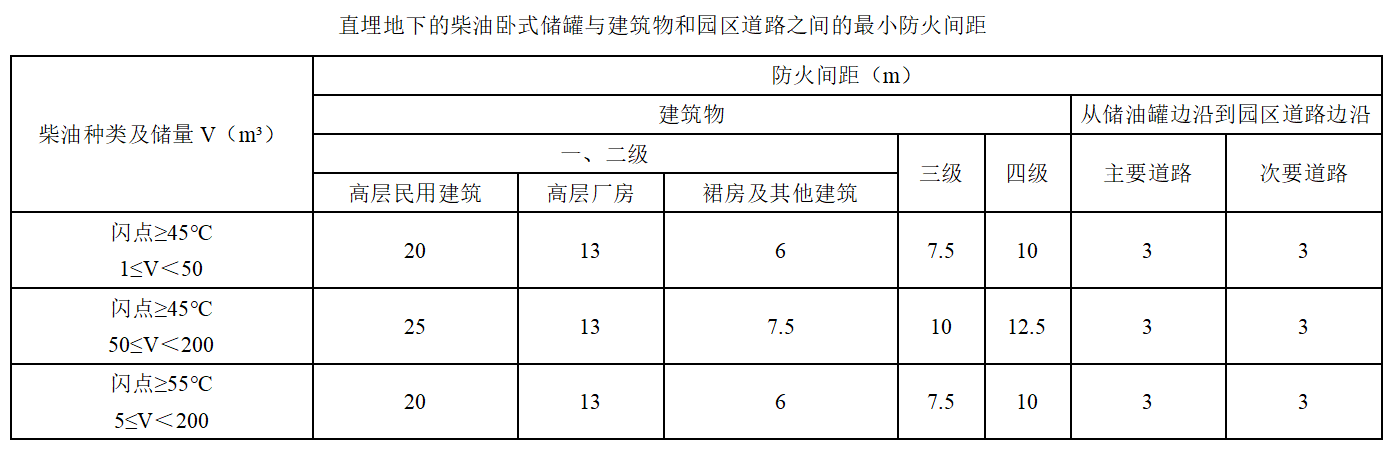 控制燃油閃點(丙類)、容量和總儲量,直埋地下。埋地油罐與建筑之間的防火間距:單罐容量不大于50立方米、總儲量不大于200立方米時與建筑物和園區(qū)道路最小間距如下圖: