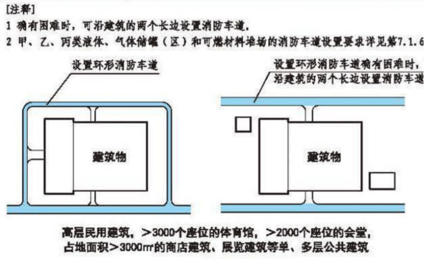 占地面積大于3000平米的丙類廠房、高層民用建筑、高層工業(yè)建筑均應(yīng)設(shè)置環(huán)形消防車道。