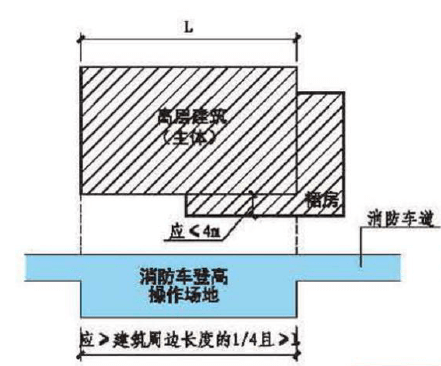 高層建筑應(yīng)至少沿一個長邊或周長1/4且不小于一個長邊設(shè)置消防車登高場地。