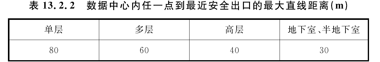 當數(shù)據(jù)中心按照民用建筑設(shè)計時,直通疏散走道的房間疏散門至最近安全出口的直線距離不應(yīng)大于表 13.2.3-1的規(guī)定各房間內(nèi)任一點至房間直通疏散走道的疏散門的直線距離不應(yīng)大于表 13.2.3-2的規(guī)定。建筑內(nèi)全部采用自動滅火系統(tǒng)時,采用自動噴水滅火系統(tǒng)的區(qū)域,安全疏散距離可增加25%。