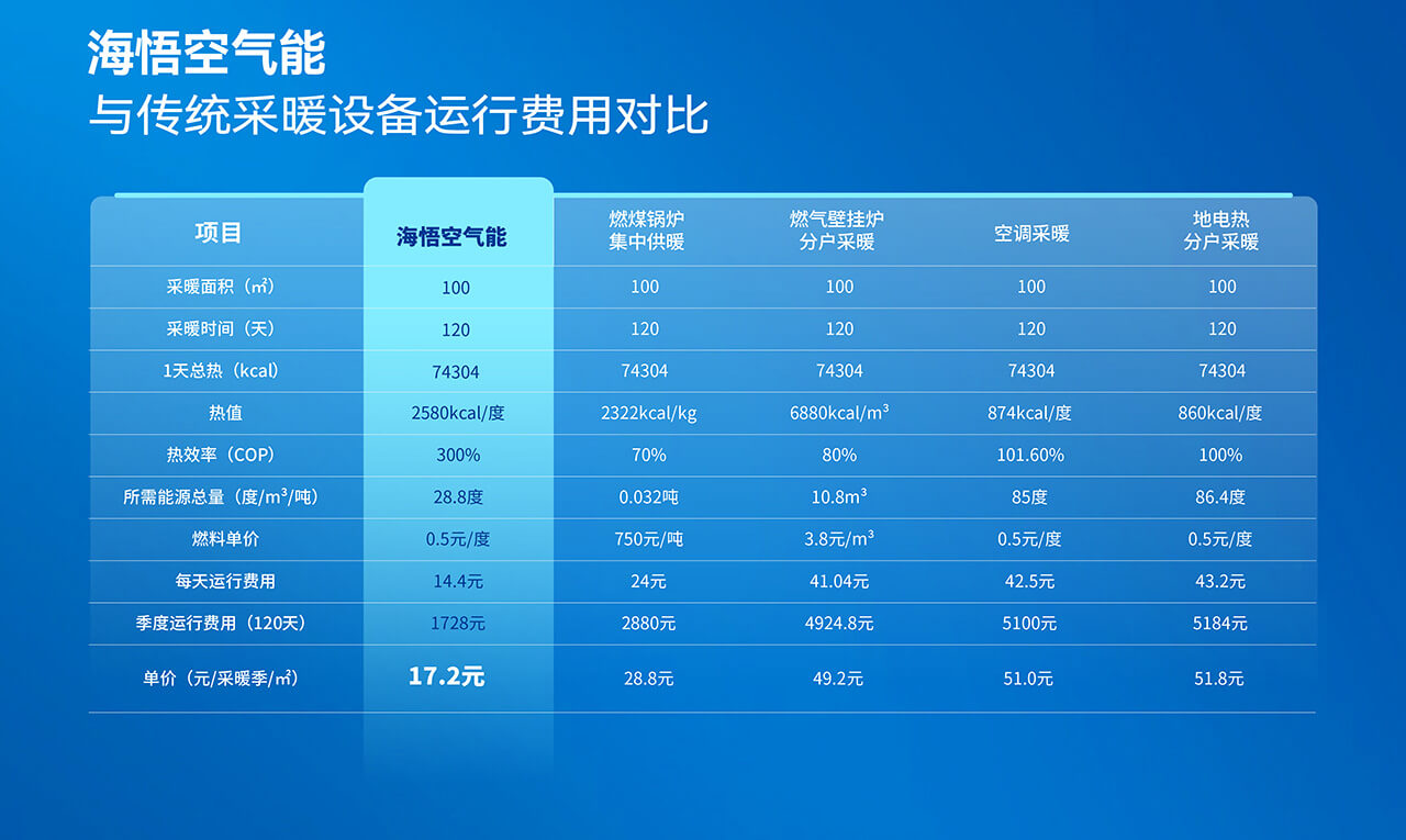 相比傳統(tǒng)采暖方式,海悟空氣能熱泵在費用上具有明顯優(yōu)勢。以一個采暖季(120天)為例,100平方米的采暖面積使用海悟空氣能熱泵的運行費用僅為1728元,單價僅為17.2元/采暖季/㎡,遠低于其他采暖方式。此外,海悟空氣能熱泵采用清潔能源,無廢氣排放,符合環(huán)保要求,讓您在享受溫暖生活的同時也為地球環(huán)保做出貢獻。