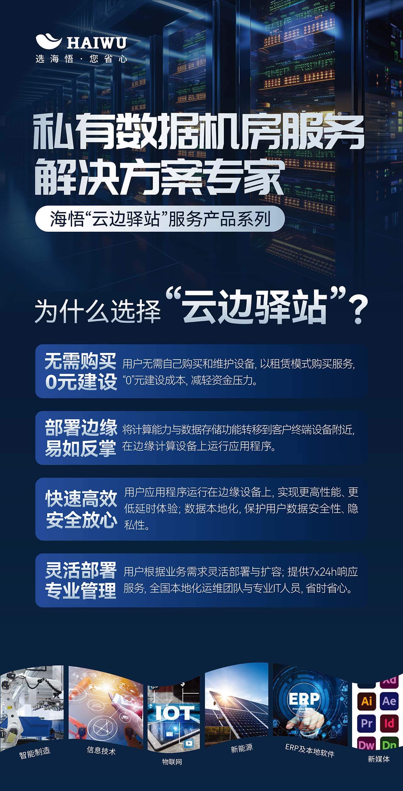 在數(shù)字化轉(zhuǎn)型的浪潮中,企業(yè)數(shù)據(jù)的安全與高效處理成為了核心競(jìng)爭(zhēng)力的重要組成部分。面對(duì)日益增長(zhǎng)的數(shù)據(jù)存儲(chǔ)需求與復(fù)雜的IT管理挑戰(zhàn),海悟云匠心打造“云邊驛站”私有數(shù)據(jù)中心托管服務(wù)解決方案,旨在為企業(yè)提供一站式的本地化算力與數(shù)據(jù)安全存儲(chǔ)方案,讓企業(yè)在享受云端便捷的同時(shí),牢牢把握數(shù)據(jù)主權(quán),專注核心業(yè)務(wù)的發(fā)展。