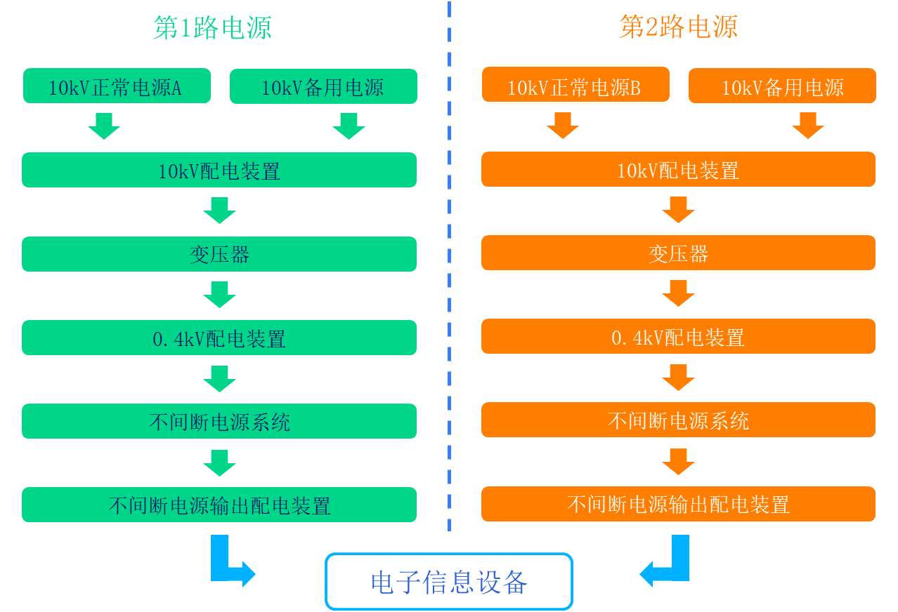 為提高電源的可靠性,電子信息設備由雙路電源供電。大中型數(shù)據(jù)中心供配電系統(tǒng)就是從10kV 電源進線,經(jīng)過10kV配電裝置、變壓器、0.4kV配電裝置、不間斷電源系統(tǒng)及不間斷電源輸出配電裝置,到電子信息設備電源進線這個過程。在這個過程中有兩種應用方式影響了數(shù)據(jù)中心供配電系統(tǒng):