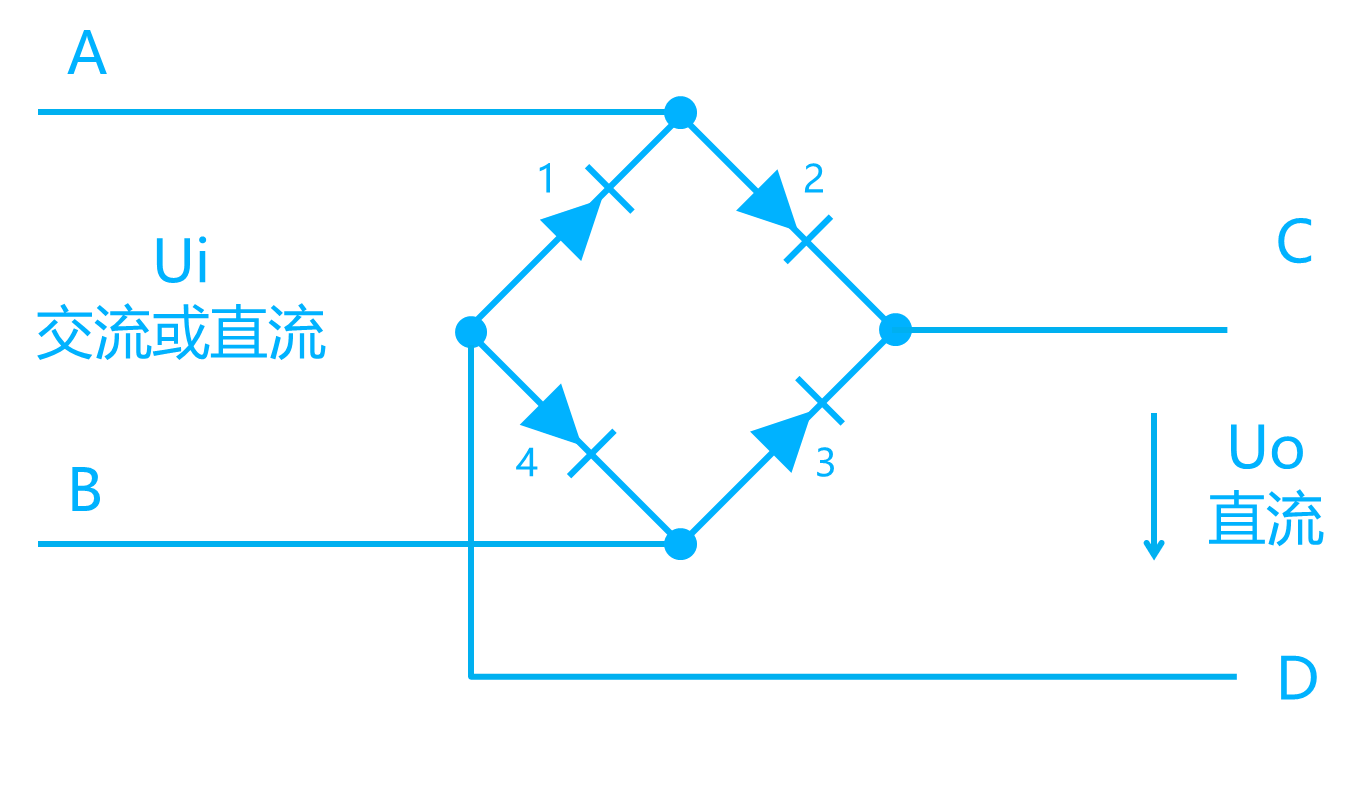 電子信息設備內(nèi)部各電路是以直流電源進行工作的,為此在電子信息設備內(nèi)部設計了一個電源模塊,無論供電電源是交流還是直流,經(jīng)過電源模塊后都變成直流,故大多數(shù)服務器等電子信息設備可以接受交流電源,也可以接受直流電源供電,其原理見圖二。圖二是電子信息設備的電源模塊接受交流或直流電源時的工作原理。當電源模塊輸入交流電時,在交流電的正半周,電流流向是A→2→C→D→4→B;在交流電的負半周,電流流向是B→3→C→D→1→A,在C和D之間形成直流電源。當電源模塊輸入直流電,且A為正極,B為負極時,電流流向是A→2→C→D→4→B,當B為正極,A為負極時,電流流向是B→3→C→D→1→A,在C和D之間形成直流電源。
