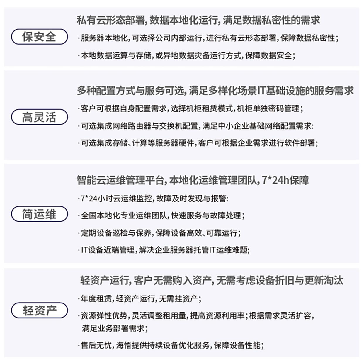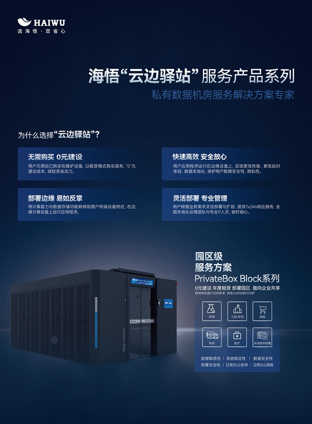 海悟云“云邊驛站”是專(zhuān)為中小型企業(yè)、商超物流、小型醫(yī)療機(jī)構(gòu)、分支網(wǎng)點(diǎn)、MES制造等輕資源需求場(chǎng)景設(shè)計(jì)的私有數(shù)據(jù)機(jī)房托管服務(wù)方案。該方案聚焦于中小型企業(yè)的私有云數(shù)據(jù)底座,提供機(jī)柜、UPS配電和服務(wù)器等基礎(chǔ)設(shè)施,助力企業(yè)輕松構(gòu)建近端私有云,實(shí)現(xiàn)數(shù)據(jù)的本地化存儲(chǔ)與管理。