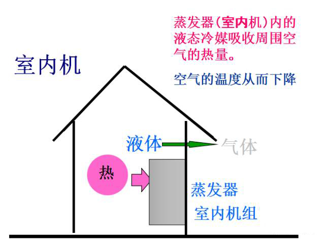 室內(nèi)的溫度較高,空氣流過(guò)蒸發(fā)器時(shí)冷媒蒸發(fā)帶走空氣種的熱量,空氣溫度降低成為冷空氣。