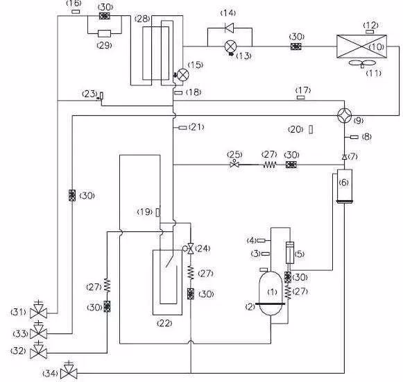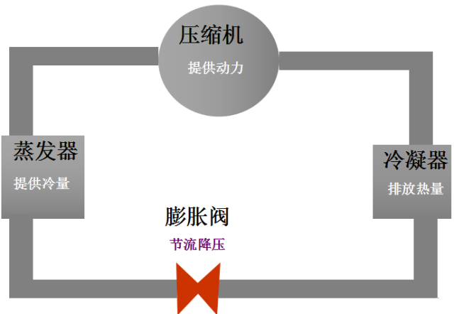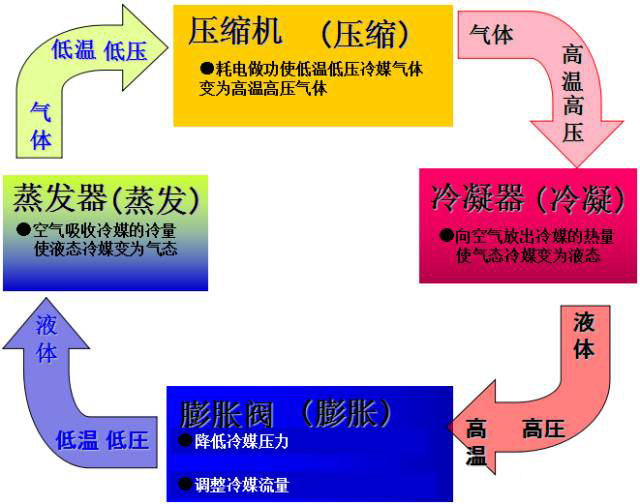 來(lái)自蒸發(fā)器的低溫低壓的冷媒氣體被壓縮機(jī)壓縮成高溫高壓的氣體進(jìn)入冷凝器