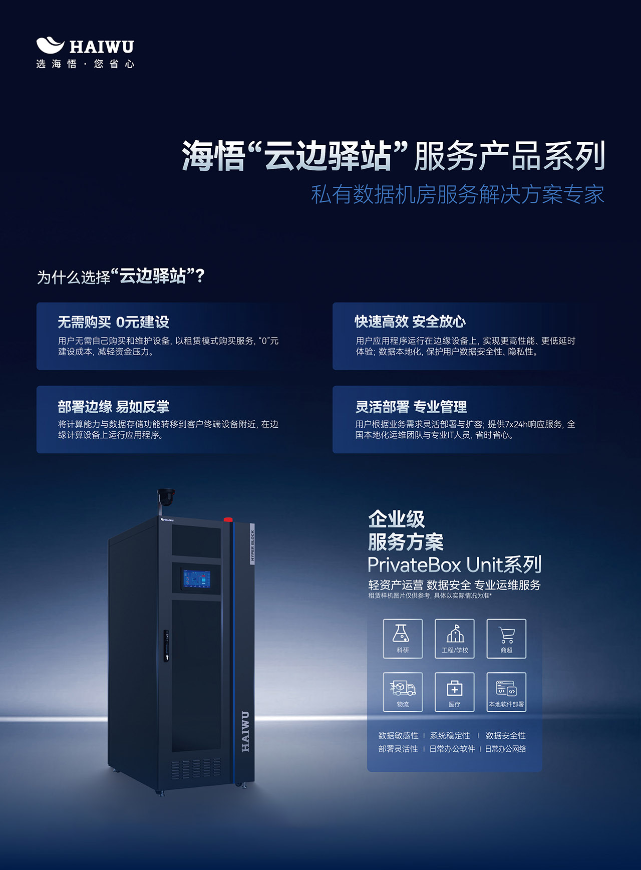 在這樣的時(shí)代背景下,企業(yè)對于本地化算力和數(shù)據(jù)安全存儲(chǔ)的需求愈發(fā)迫切。海悟云憑借敏銳的市場洞察力和深厚的技術(shù)實(shí)力,精心打造了“云邊驛站”企業(yè)級(jí)本地化私有數(shù)據(jù)機(jī)房托管服務(wù)解決方案,為企業(yè)提供了一站式、全方位的數(shù)據(jù)中心托管服務(wù),助力企業(yè)在激烈的市場競爭中脫穎而出。