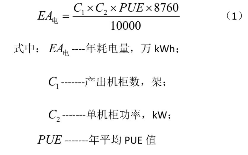 根據(jù)數(shù)據(jù)中心項目產(chǎn)出機柜數(shù)、單機柜功率、年平均PUE 值可求得數(shù)據(jù)中心年耗電量, 計算公式如下: