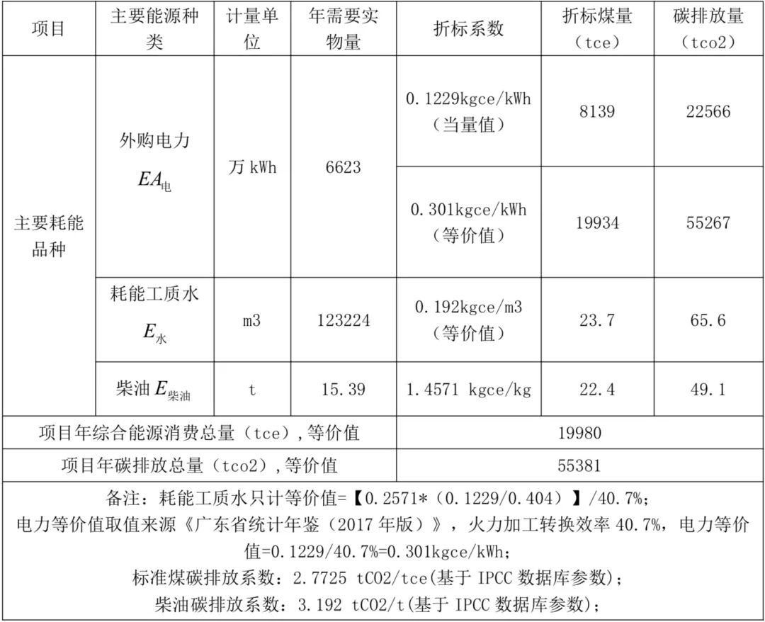根據(jù)公式 1 至公式 7 對該項目進行綜合能源消耗計算及碳排放核算,計算結(jié)果如下: