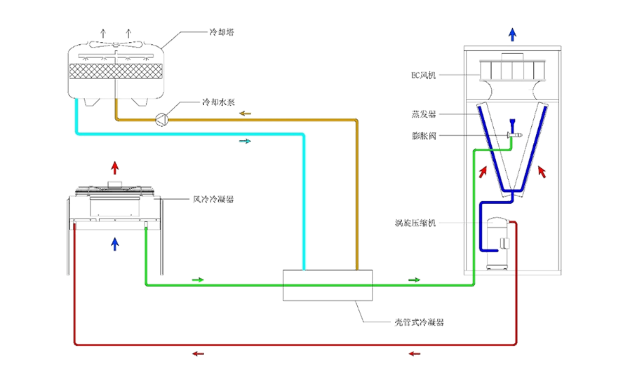 串聯(lián)分布式水冷換熱器,由冷卻塔代替風(fēng)冷冷凝器進行排熱;工程預(yù)制化,換熱器、水泵、與控制系統(tǒng)集成;自適應(yīng)控制單系統(tǒng),安全性更高